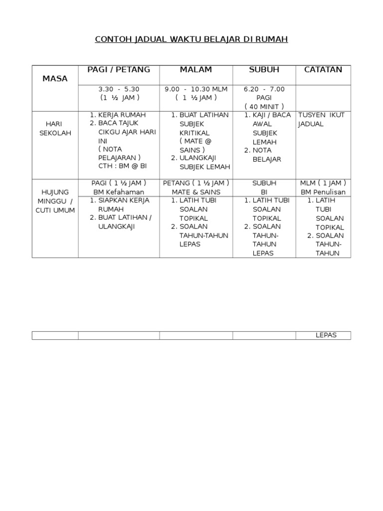 Contoh Jadual Waktu Belajar Di Rumah Pdf